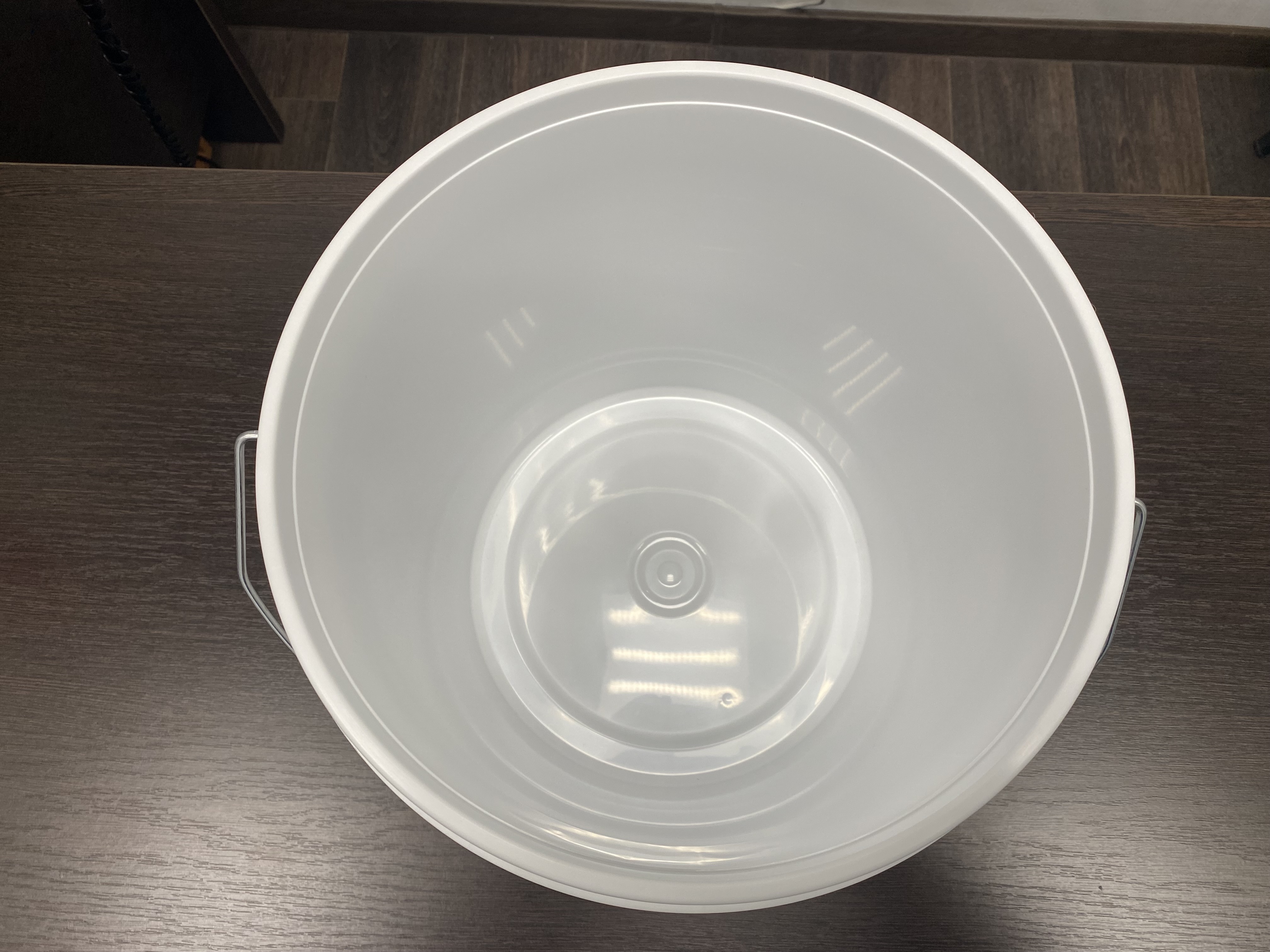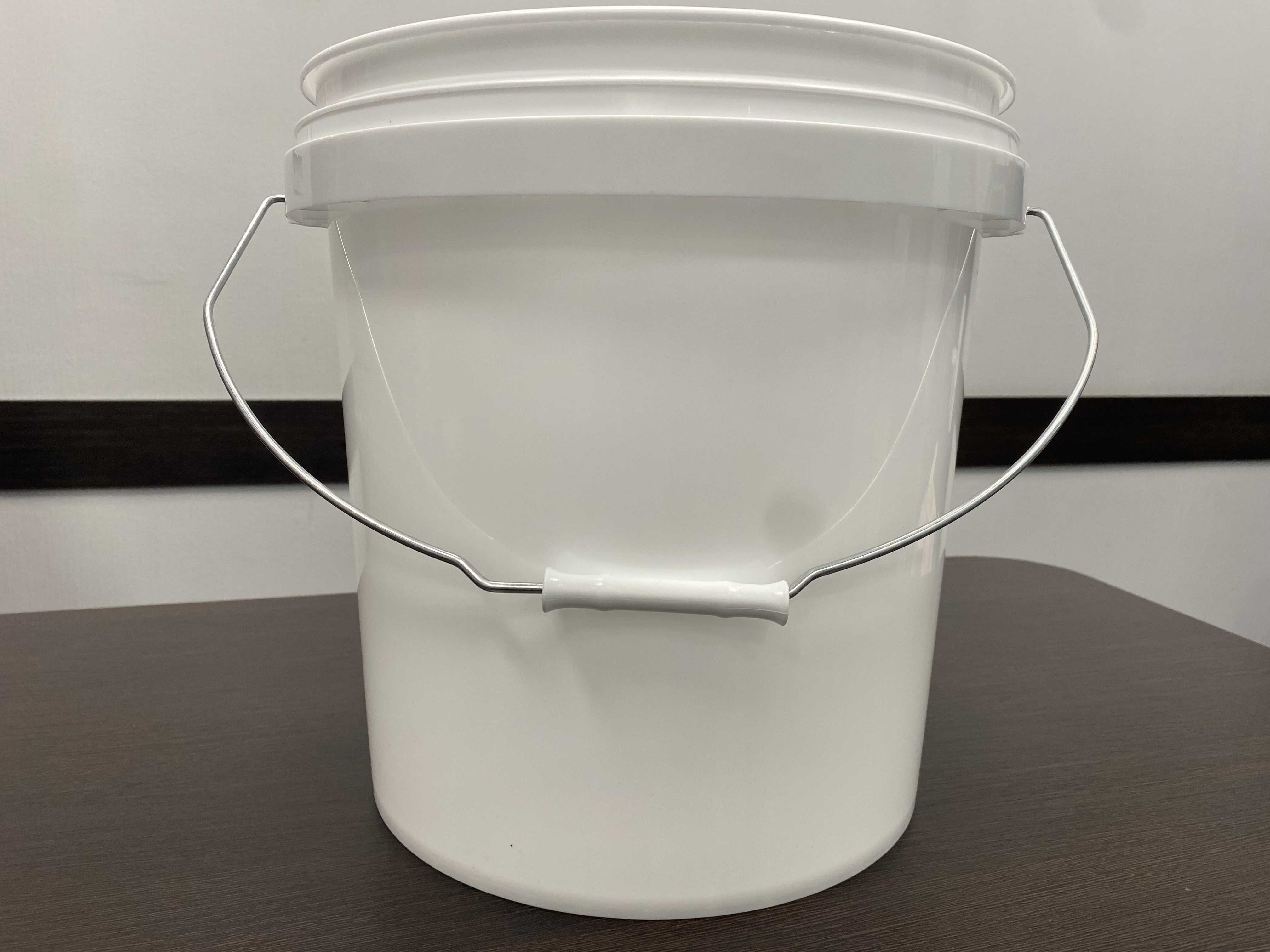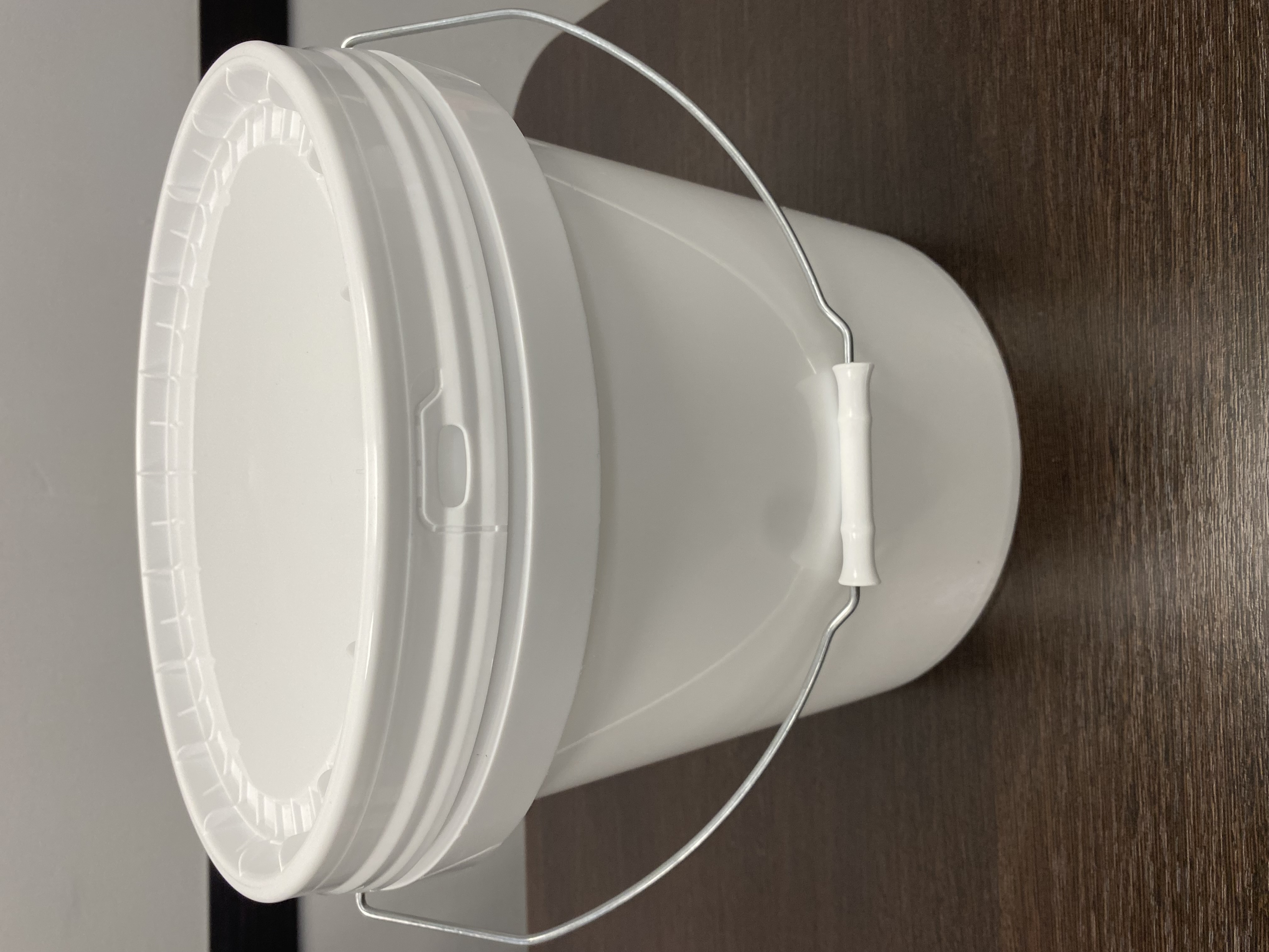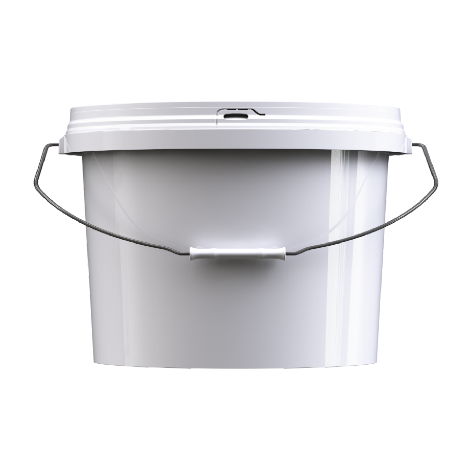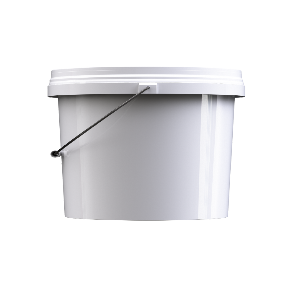 Пластиковое ведро JHPS 1550 белого цвета объемом 16,9 литра (или 4 галлона) с металлической ручкой (есть ролик) и пластмассовой крышкой LHPS 3100. Пластик - первичный, пищевой, без добавления материалов вторичной переработки.
