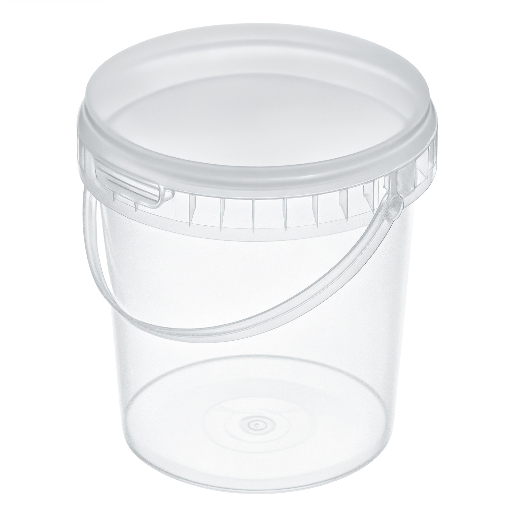 Прозрачное пластиковое ведро объемом 0,85 литра, с ручкой и крышкой. Предназначено для хранения и транспортировки пищевой и промышленной продукции.